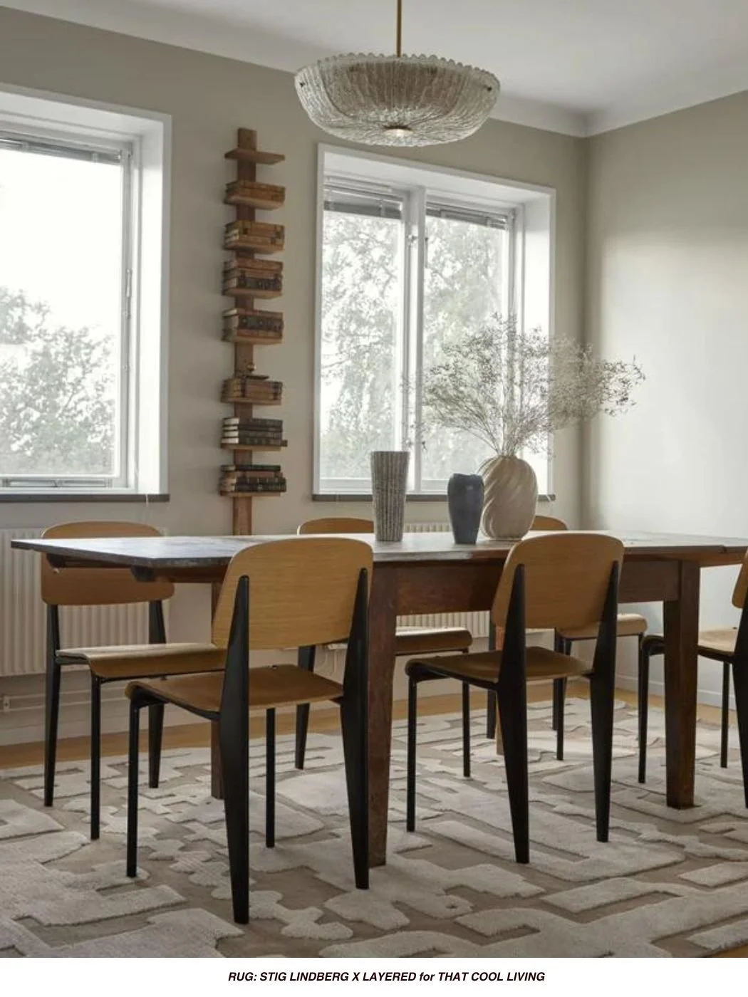 A low-pile rug, scaled to complement the table and chairs, is essential for creating a harmonious dining space.