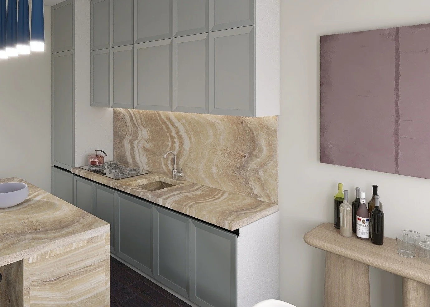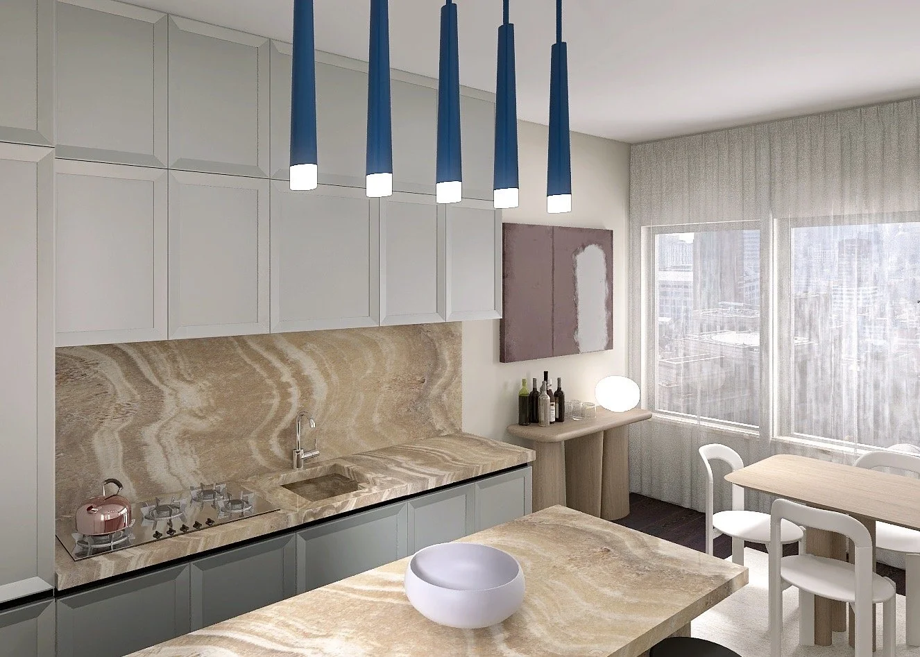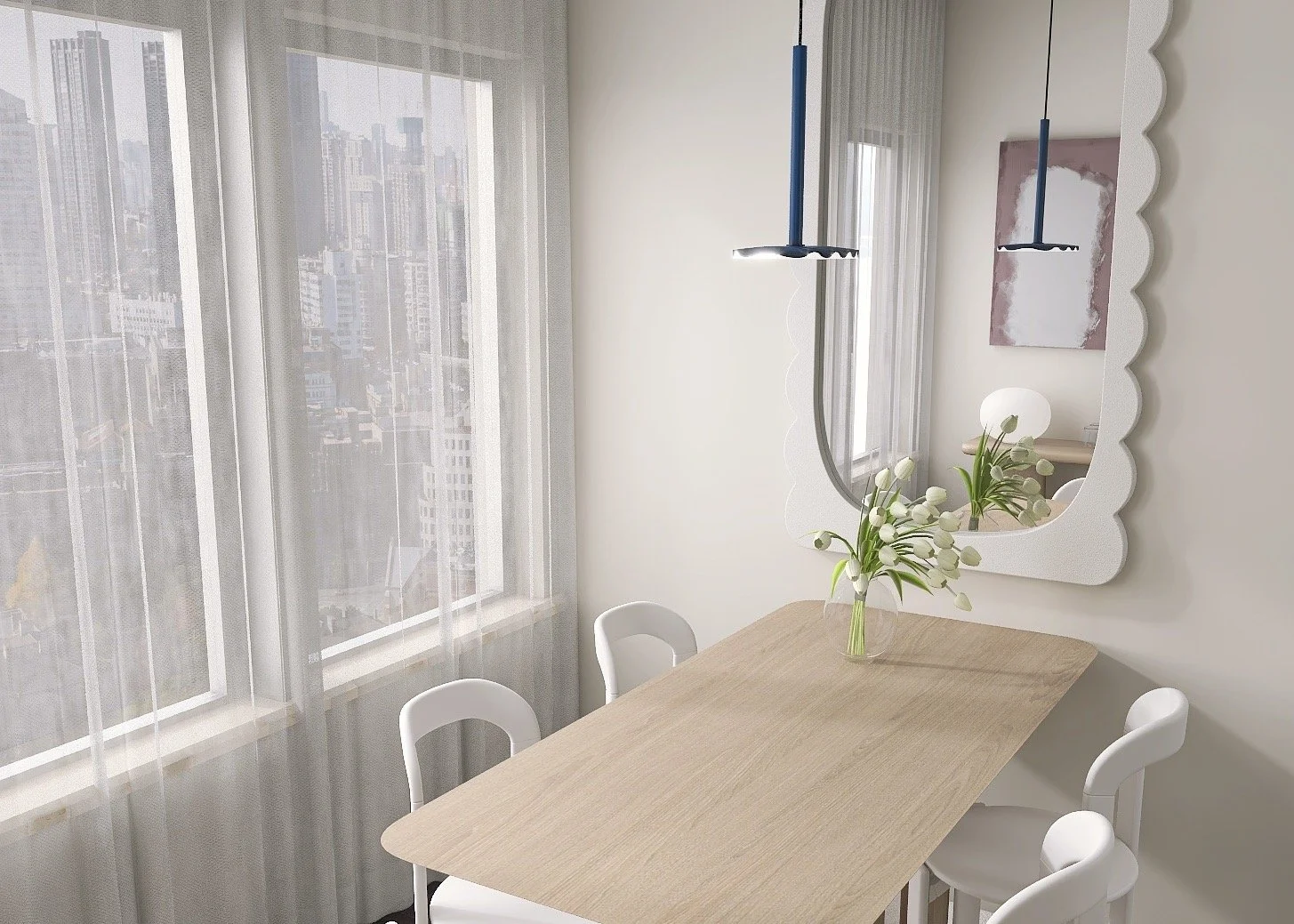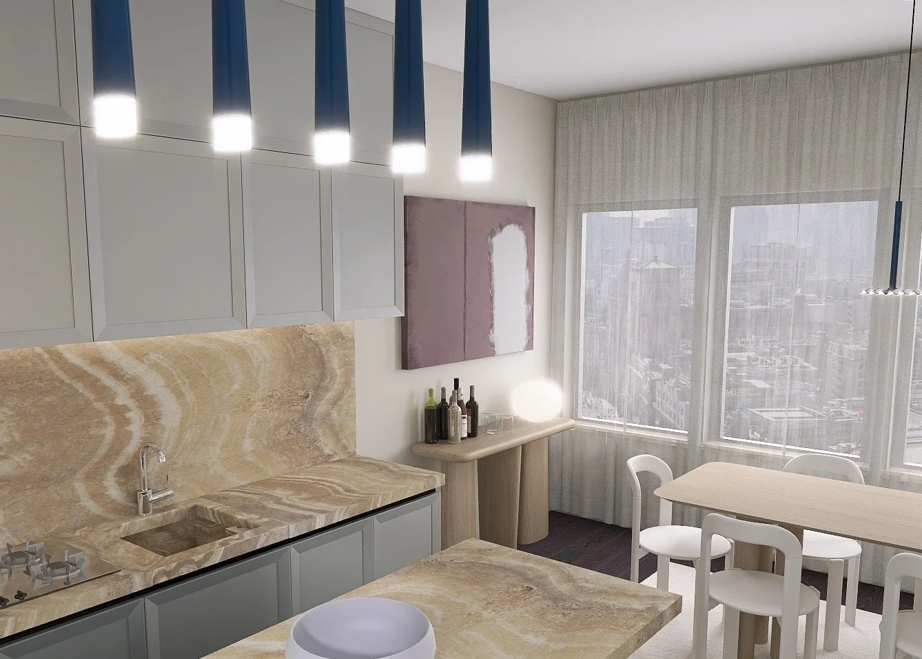 Designed to feel bright and uplifting, this combined kitchen and dining room is an airy retreat from the energy of Williamsburg - open, calm, and quietly refined. The client envisioned a space that felt effortless yet elevated, with sculptural moments woven throughout. We played with contrast and form, from the soft curves of the dining chairs to the sharp lines of satin-finish steel-clad cabinetry. Green onyx countertops introduce lightness and movement, anchoring the space with natural variation while adding a touch of whimsy and boldness. The clients, a creative duo, value timeless and artistic pieces that bring personality to their home. The dining area feels relaxed and welcoming, comfortably sized for small gatherings without feeling crowded.